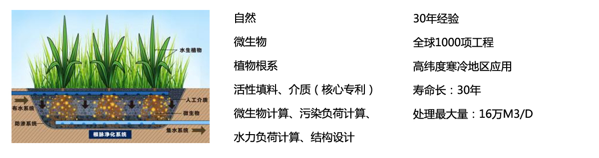 概念:水平潛流人工濕地是污水從一端水平流過填料床,污水在填料床內部流動,水位較深,可以充分利用填料表面、植物根系上生長的生物膜和豐富的植物根系、表土層及填料的截留作用。
