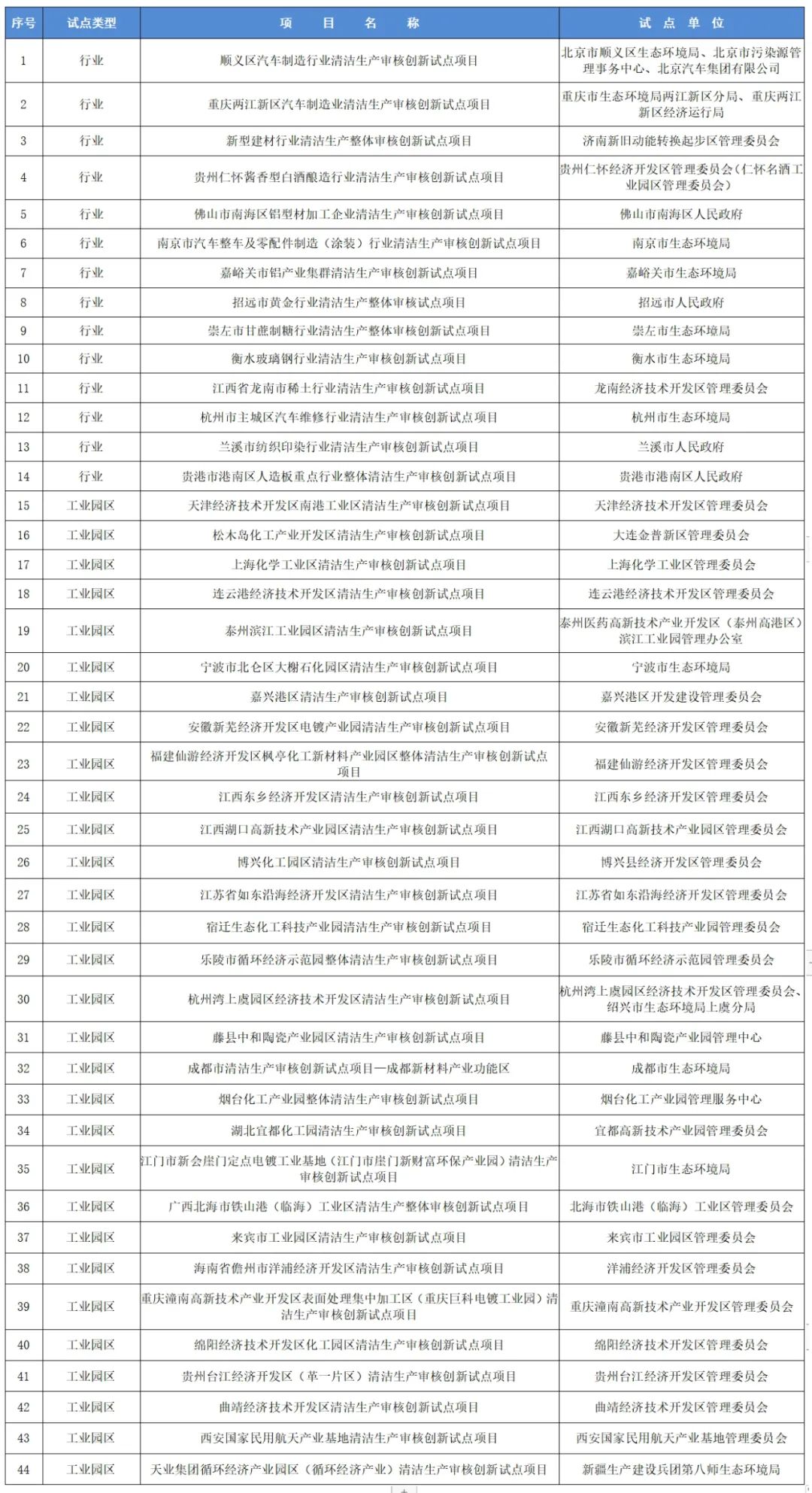 為深入貫徹黨的二十大和二十屆三中全會精神,認真落實《“十四五”全國清潔生產推行方案》,強化清潔生產在重點行業、重點區域減污降碳和產業升級改造中的重要作用,近期,生態環境部與國家發展改革委聯合篩選了56個項目開展第一批清潔生產審核創新試點工作。經研究,44個清潔生產審核創新試點項目通過評估,現予公布。